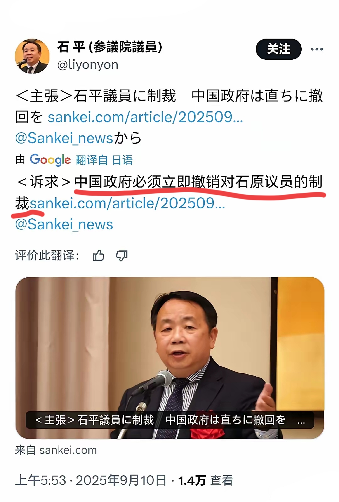 就在9月10号大清早五点多,天刚蒙蒙亮,也不知道石平夜里梦着啥了,突然跟打了鸡血似的发了条帖子,那口气硬得能硌掉牙,嚷嚷着让中国政府“必须”“立刻”把对他那点制裁给撤了。