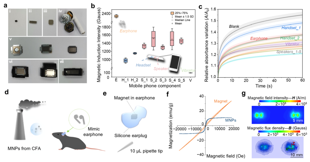 图1. 耳机/智能手机内置磁场(EEM)的表征及共暴露小鼠模型的构建。 (a) 手机及模拟耳机的组件,内含EEM:(i)模拟耳机中的磁铁;(ii-iii)听筒;(iv)耳机(磁铁圈出);(v-vi)扬声器;(vii)振动器。 (b) 来自手机和耳机的EEM暴露强度。 (c) EEM对小鼠血浆中PM₂.₅内暴露行为的影响。 (d) 共暴露小鼠模型示意图。 (e) 模拟耳机的构成。 (f) 耳机磁铁与从粉煤灰中提取的磁铁矿纳米颗粒的磁滞回线。 (g) 模拟耳机的模拟磁场。